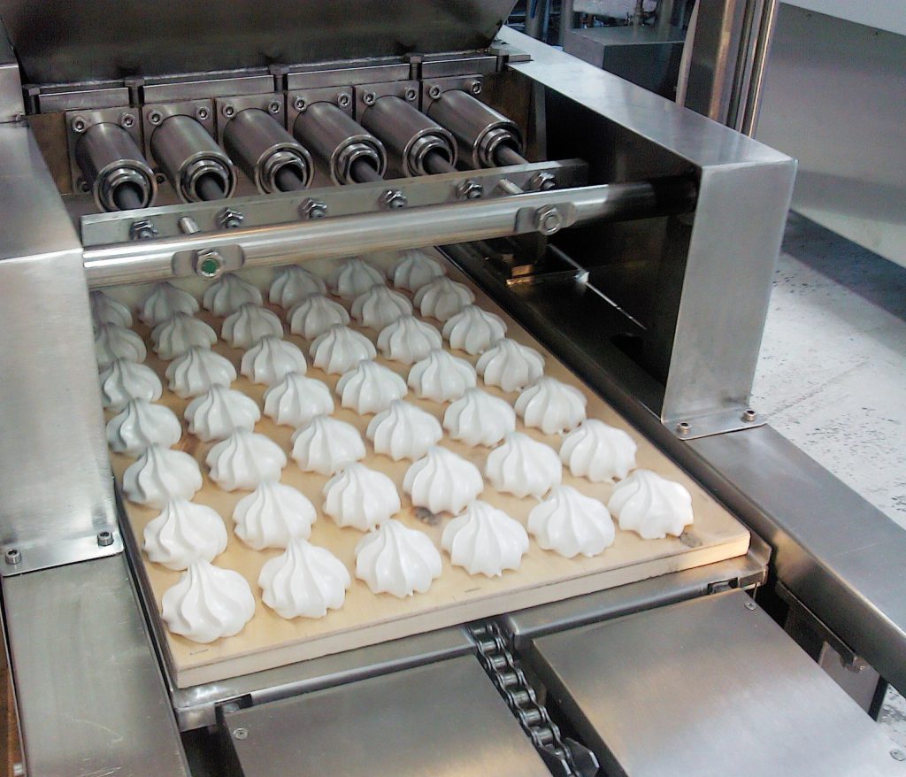 Далее в сбивальной машине поэтапно соединяют пюре, яичные белки и горячий сироп. Процесс сбивания с приоткрытой крышкой способствует аэрации и испарению лишней влаги. После тщательного вымешивания готовая масса поступает на отсадочную машину, которая формирует полусферы.